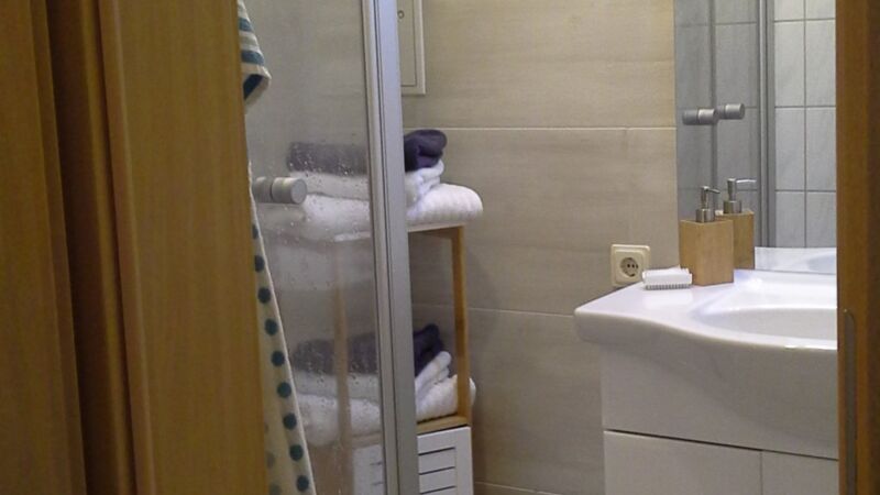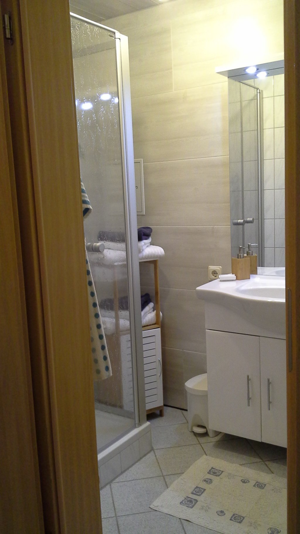 - Bad mit Dusche, Waschbecken, großer beleuchteter Spiegel, Föhn und Lüfter.