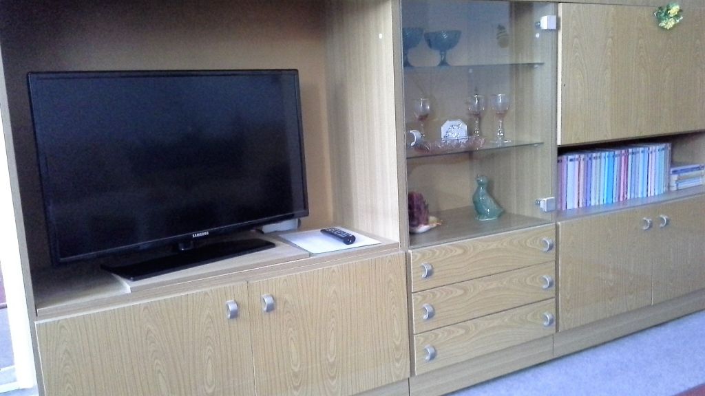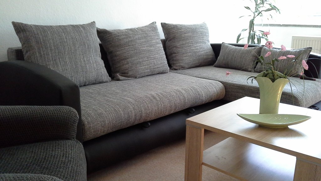 - Wohnzimmer mit Flachbild – TV, Anbauwand, Sessel, Tisch, Teppichboden, Stehlampe und Ecksofa nach vorn auszuziehen.