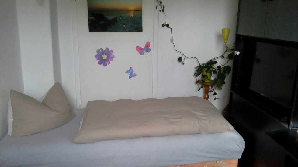 - Zweites Schlafzimmer mit Einzelbett, Anbauwand mit Flachbild – TV, Tisch und zwei Stühle.